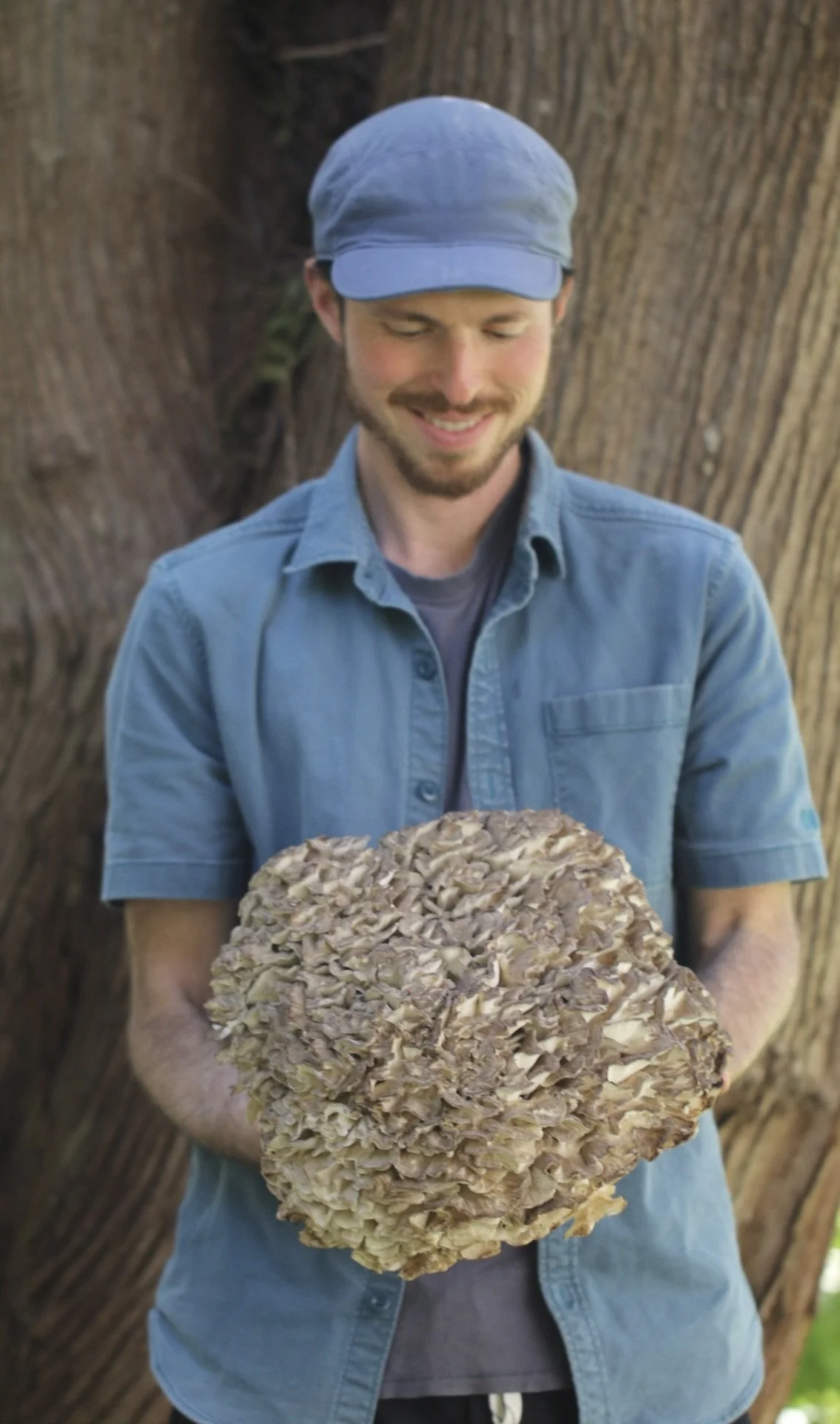 I wrap my palms around the base of the most mature hen, leaving the other two in the ground to continue roosting and dropping spores. With a gentle wiggle, the maitake easily and cleanly detaches from the ground at the bottom of its central stalk. The hard part, it turns out, is picking up this behemoth and hauling it safely out of the woods. This bug-free hen is not just voluminous – it is remarkably dense and muscled, its heft unable to be contained by the full-size paper grocery bag I have stashed in my pack. Improvising, I remove my flannel shirt and wrap it snugly around the singular specimen, hoisting it up to my chest and flexing as I haul it proudly out of the woods. I bushwhack cautiously downhill, struggling not to fall (or worse, drop the spectacular hen) as I make the short but steep return journey to my vehicle. There, it finds a temporary home in my five-year-old’s empty car seat, which happens to fit the maitake like a charm.